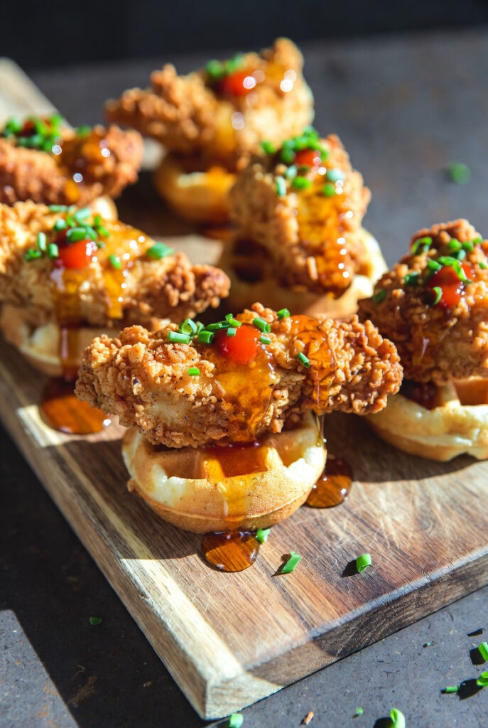 - Assemble your stacks. Place a mini waffle on a serving tray, top with a crispy chicken piece, drizzle with maple syrup or honey butter, add a dash of hot sauce, and finish with a pinch of chives. Done. Beautiful. Perfection.