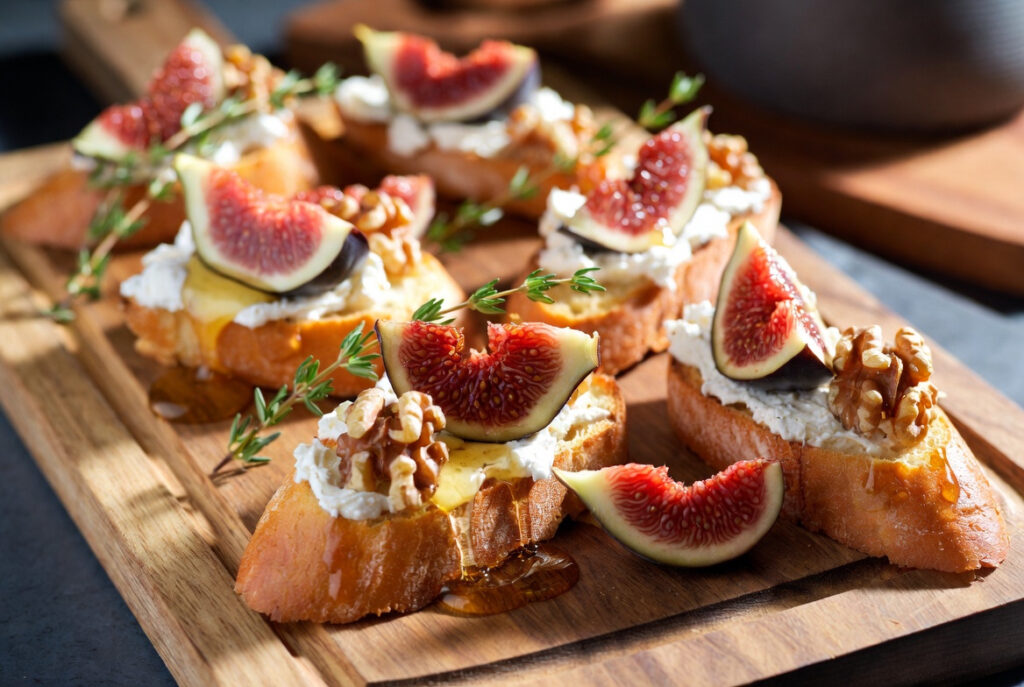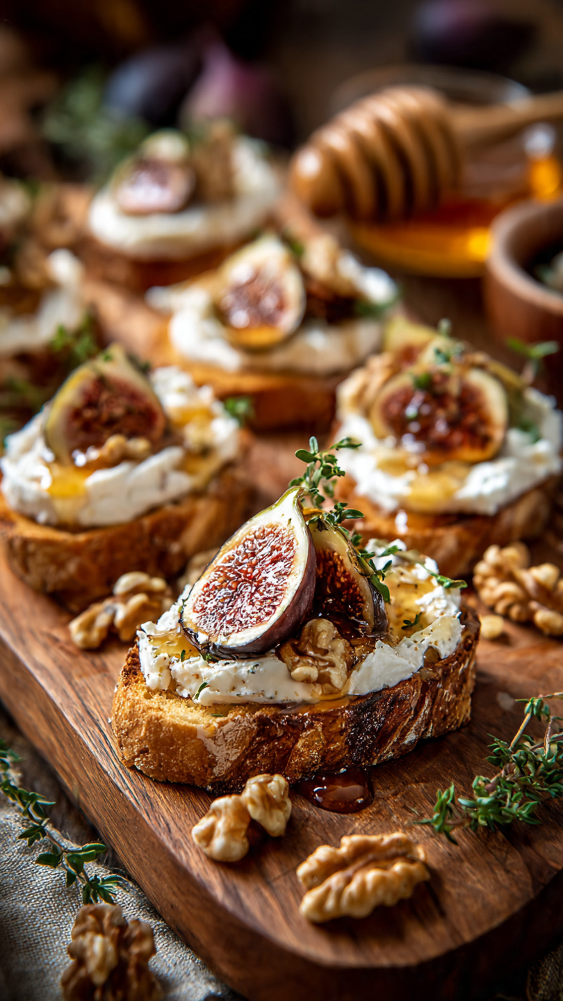 5. Assemble the platter. Spread a generous spoonful of whipped goat cheese onto each crostini. Add toppings — figs, walnuts, fresh herbs — and drizzle honey liberally over everything. Be generous here. This is genuinely not the moment for restraint.